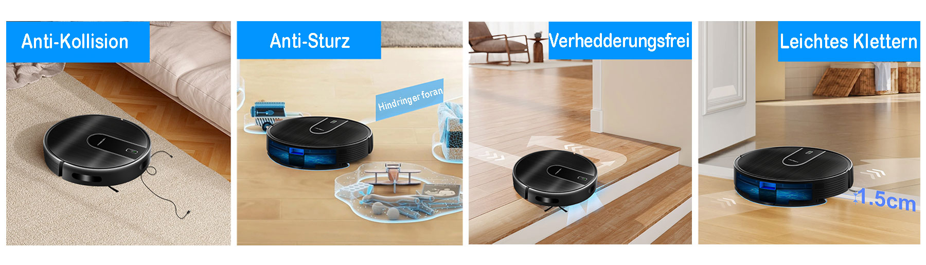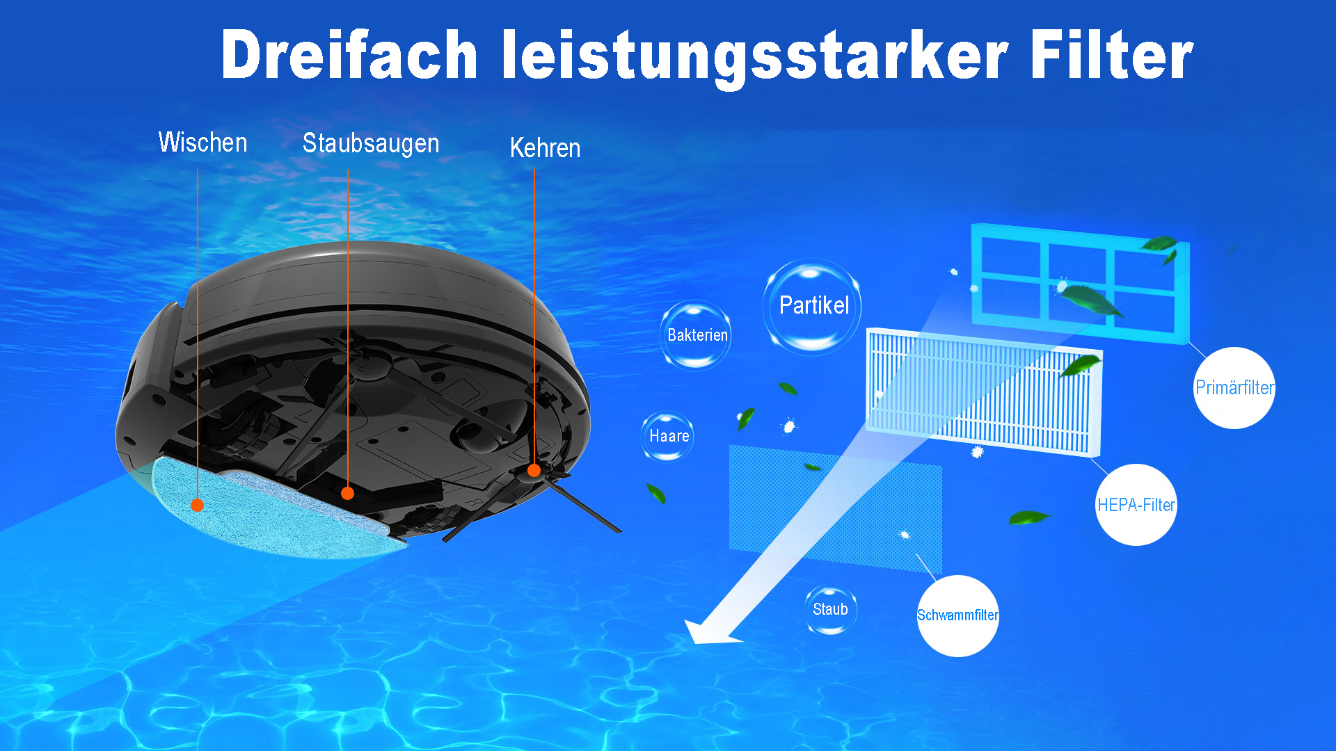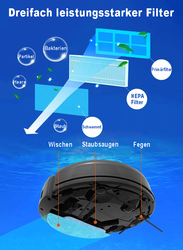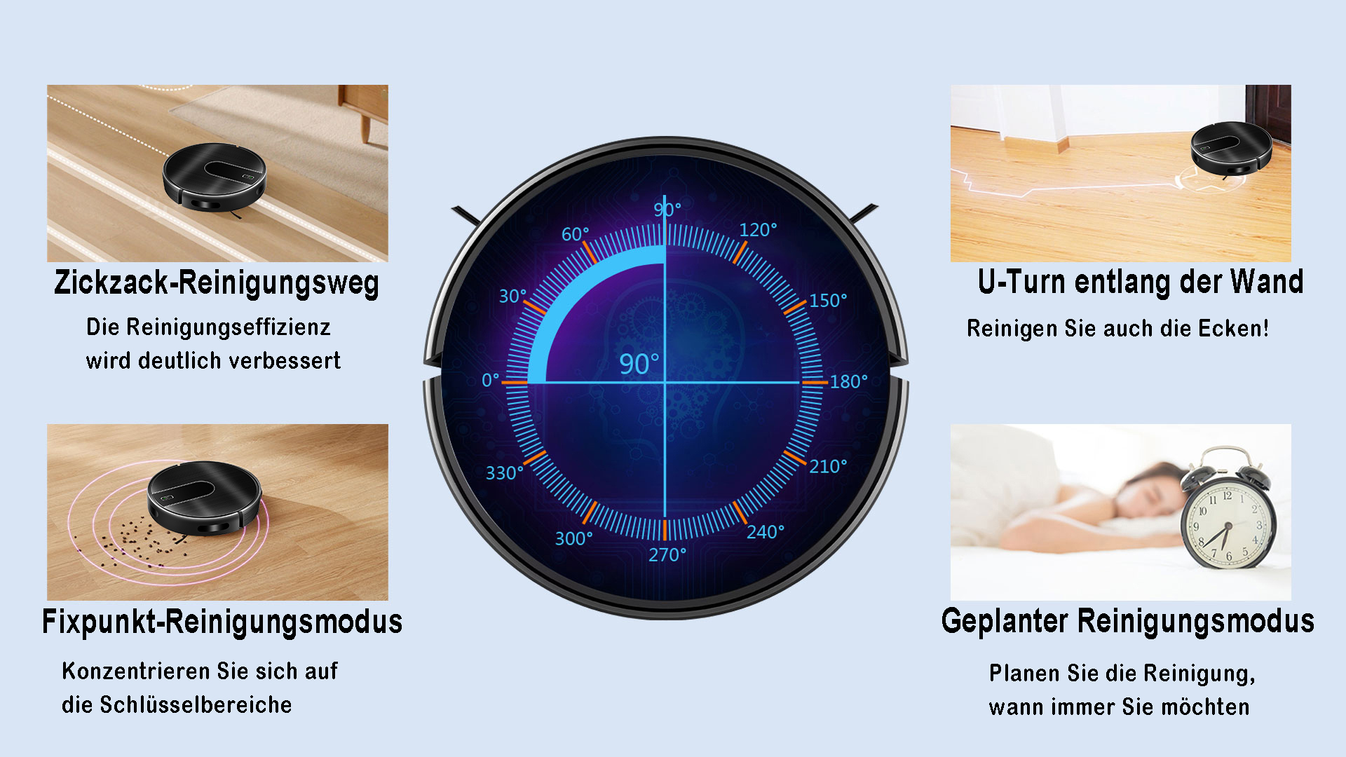 Es kann mit dem Internet verbunden und über eine mobile App gesteuert werden. Über die App können Sie die Reinigung starten, die Reinigungszeit einstellen, zwischen verschiedenen Reinigungsprogrammen wechseln und die verbleibende Akkulaufzeit prüfen. Darüber hinaus ist eine Steuerung über Alexa oder Google Home möglich.